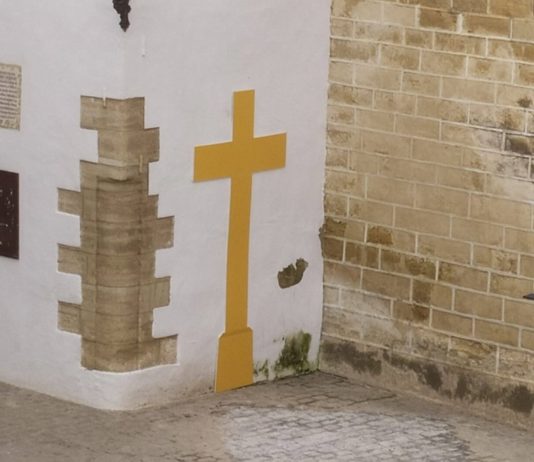 Un grupo de personas pegan una cruz a la pared de las Descalzas